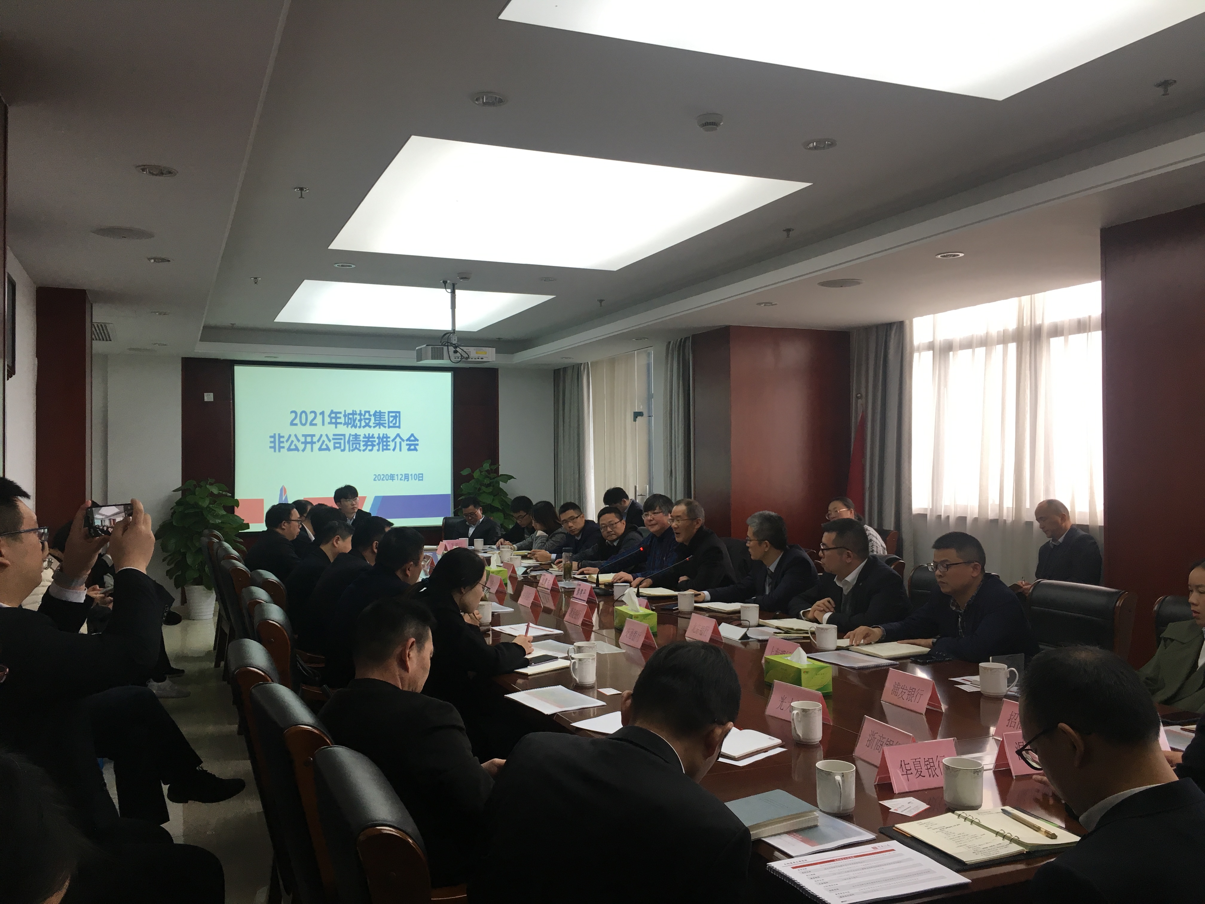 12月10日上午,建設(shè)集團(tuán)在五樓會議室召開城投集團(tuán)2021年非公開公司債券推介會。集團(tuán)董事長滕建平、副總經(jīng)理包震東、華安證券債券總經(jīng)理陳紹山以及工商銀行、農(nóng)業(yè)銀行、中國銀行、建設(shè)銀行、交通銀行等24家銀行有關(guān)代表和華安證券項(xiàng)目組共50余人參加會議。